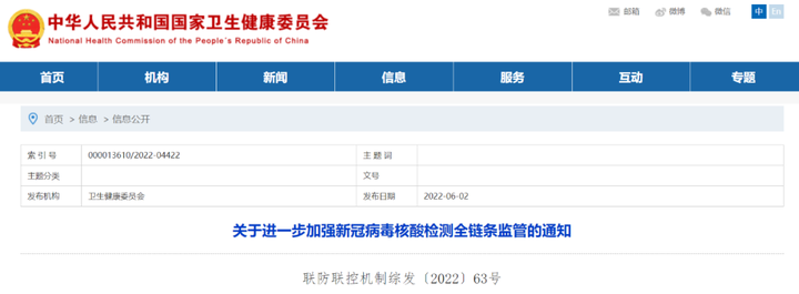 6月2日,国家卫健委发布《关于进一步加强新冠病毒核酸检测全链条监管的通知》。