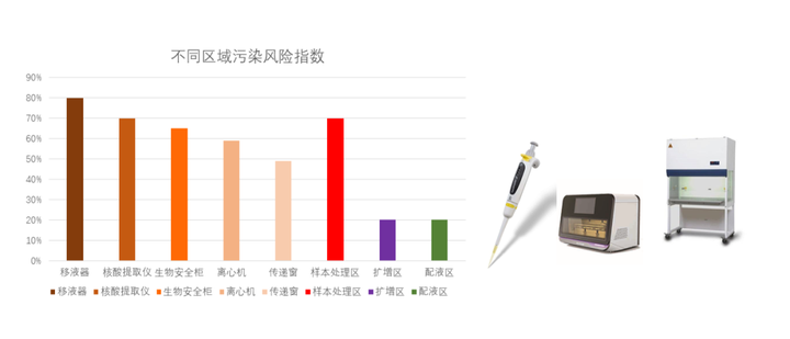诺威仕吕工在某实验室发生污染时,在不同区域分别采集10个样本,通过PCR扩增分析后,比较不同区域的阳性检出率。发现样品处理区的核酸提取仪与离心机污染的程度最高(8/10)。在临床实践中,移液器也是污染的高风险项。
